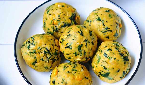 ?玉米粉芹菜窩頭,玉米粉用開水燙一下,口感就會很軟和瞭,加入十分之一的糯米粉後口感會更好喲,芹菜葉稍微切碎點,加入粉中一起揉成面團,一個個滾圓後,蒸15分鐘就可以瞭。