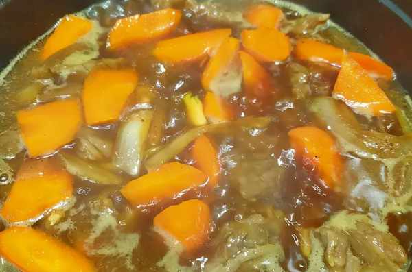 2、加水(要淹過食材)煮到水滾,蓋上鍋蓋轉中小火煮約20分鐘,20分鐘後掀蓋,鋪上紅蘿卜塊(先不翻動)再蓋上蓋子續煮至肉軟(約40~50分鐘)中間再將紅蘿卜翻拌一下,煮到收汁即可起鍋盛盤享用囉~