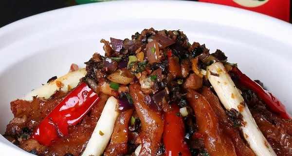 2.鍋入油燒熱,下肉丁煸炒出油,投入薑米、蒜米、豆瓣醬炒香後,再下泡辣椒段、大蔥段、洋蔥粒、香菇粒、芽菜末煸炒出香味,接著摻入適量高湯,並放入豬蹄筋燜一會兒,然後調入鹽、雞精、味精、蠔油。開大火將汁水收幹後,淋入香油、藤椒油,撒些蔥花,起鍋裝盤便好。