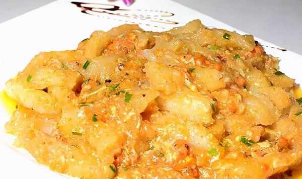 1、用水發蹄筋與蟹粉同烹,成菜蹄筋軟糯、蟹粉鮮美。其制法是:先將水發蹄筋剝去衣膜,切成約3.5厘米長的段,然後下沸水鍋裡汆水後,撈出來瀝水。