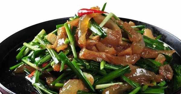 2.凈鍋裡放菜油燒熱,先下爛肉末炒香,再把小米辣椒絲和拍大蒜瓣下鍋炒幾下,加入蹄筋後,邊炒邊調入味精和雞精,在把韭菜段下鍋快速翻炒的同時,加入辣鮮露、東古醬油和美極鮮,炒勻便起鍋裝在燒熱的鐵板上,即成。
