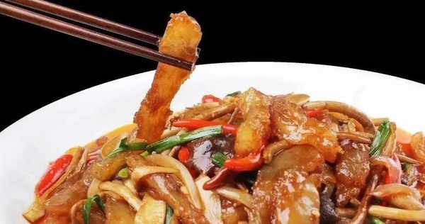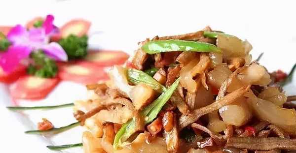 2、另把鮮茶樹菇切成段,入熱油鍋過一下油以後,撈出來瀝油;另把火腿腸、筍尖、杏鮑菇和豬肥膘肉切成丁,一並下到六成熱的油鍋裡,炸至色金黃撈出。3、鍋留底油,放入海鮮醬、叉燒醬、排骨醬和蠔油炒香出味,等到下青紅椒節、火腿腸丁、筍尖丁、杏鮑菇丁和豬肥膘肉丁略炒幾下,再放入蹄筋條和茶樹菇段,邊炒邊調入鹽、味精和雞精,出鍋裝盤便好。