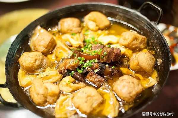 一品鍋是黃山人冬季常吃的一種火鍋,其食材非常豐富,是將幹筍、肉塊、肉圓、粉絲、青菜等堆疊烹煮,用文火煨熟而成。