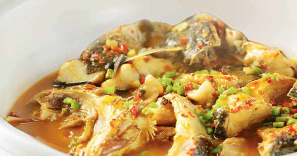 鍋燒熱,倒入熟豬油150克,先放入鹽9克(先放入鹽可以防止魚皮粘鍋),下入魚頭和魚塊(有皮的一面朝下)煎至魚皮色澤金黃,將魚翻面,下入薑丁、小米椒碎、紅椒粉各15克,獨頭蒜30克翻炒出香味,倒入沸水1.5千克、燒沸的魚湯500克、黃椒粉(幹黃貢椒磨成的粉)30克,大火燒開後轉中火,約煮6分鐘,再放入西湖味精40克、勁霸雞精50克、白胡椒粉15克、東古一品鮮醬油30克,加蓋再燒2分鐘,最後下入熟豬油50克、青杭椒圈30克繼續燒15秒,取出裝盤即可。