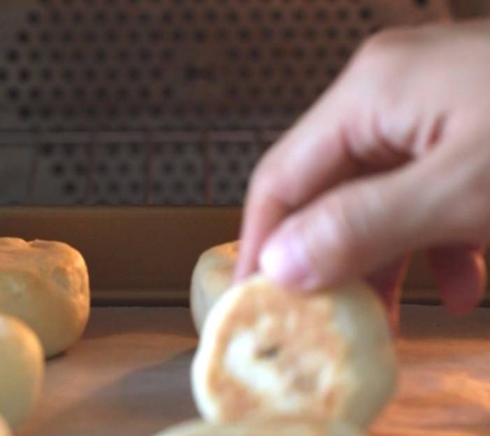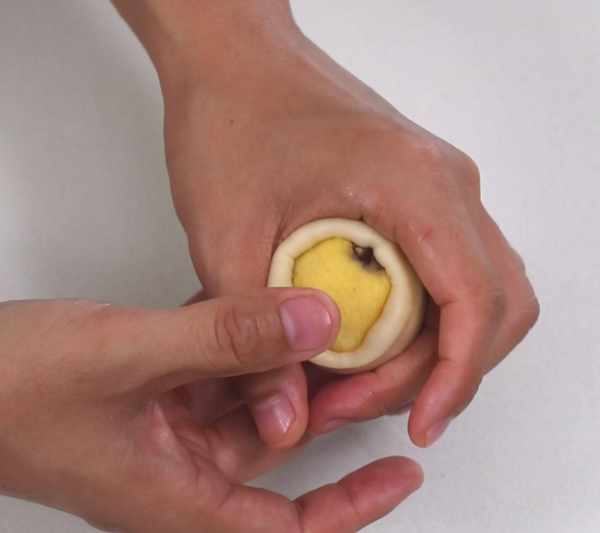 捏扁小面團,放入餡球,用虎口慢慢往上推,直到收口捏緊。不知道手法,可以看看方子上面的視頻。