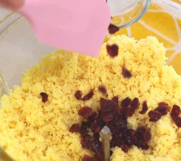 再加提前切碎的10g蔓越莓幹拌勻,為啥不把蔓越莓幹跟綠豆一起打碎呢,因為一起打會太碎,就不好看瞭。
