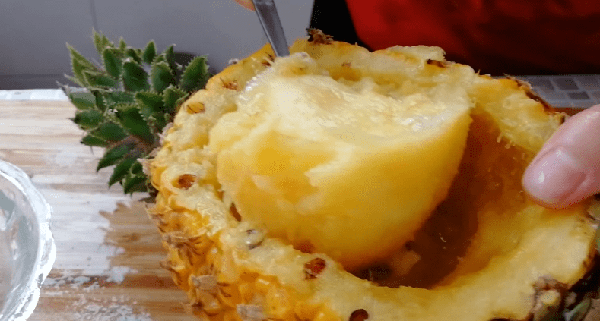 1.首先,將500克糯米洗凈,放入水中浸泡20分鐘。再挑一個成熟的菠蘿,把它切成兩半。最好在這裡把它切成兩半。用勺子刮去菠蘿肉和菠蘿汁,把一塊肉切成小塊,放在碗裡待用。把肉刮到2厘米左右,註意不要刮穿。