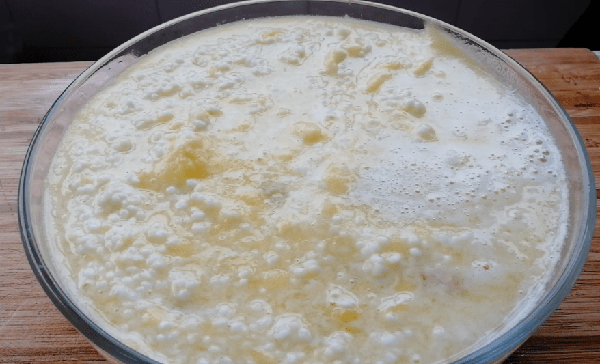 3.一個小時後,將糯米攪拌均勻,取出一粒糯米品嘗,感覺菠蘿汁完全融入糯米中,就可以放入大盤瞭