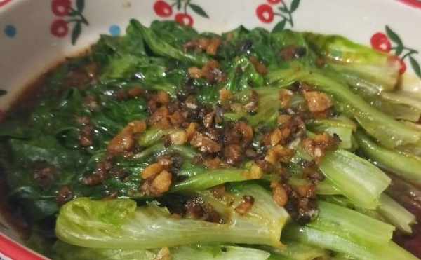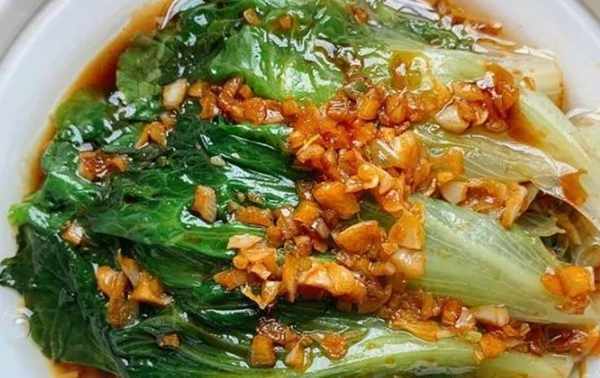 5、起鍋熱油,油熱後放入蒜末煸炒出香味,然後倒入調好的碗汁,大火加熱燒開,一直燒到湯汁濃鬱,最後澆在生菜上面,就可以端上桌食用。