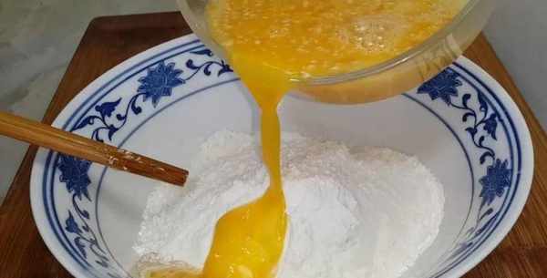 加入300克的面粉,倒入雞蛋液和面,雞蛋液一點點倒入,攪拌成絮狀。