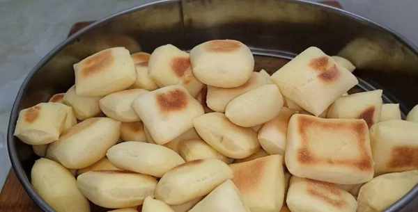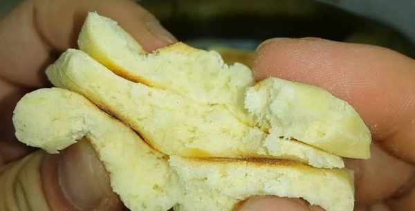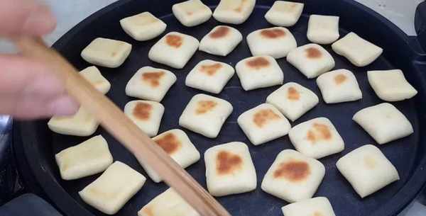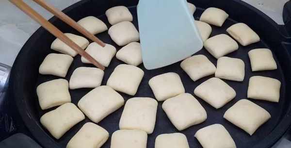 烙至小餅幹鼓泡,底部焦黃,筷子翻面,也可以是小面包。