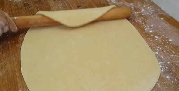面團揉出面團氣泡,放入案板,搟杖按壓,搟成一張大餅。