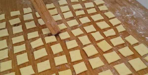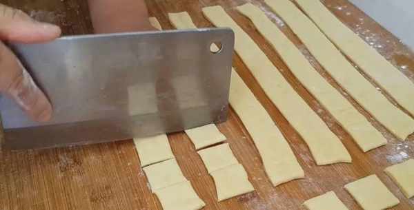 面餅整理成長方形,先切成寬寬的長條,再切成小方塊。