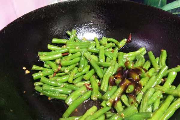 5、接下來倒入焯過水的豆角,翻炒均勻,大概煸炒一分多鐘。在出鍋前加入蠔油,上色提味。混合均勻後即可關火,出鍋裝盤。