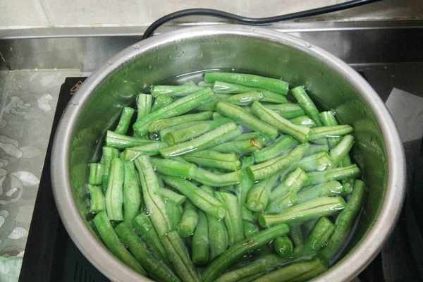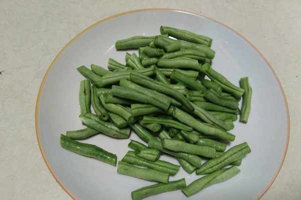 2、鍋中加水燒開後,在水中加入鹽,油以及豆角進行焯水。直到豆角斷生後撈出,在涼水中過一遍,並且控幹水分。