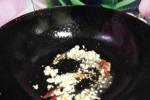 4、先熱鍋後倒入涼油,緊接著加入蒜碎和辣椒絲煸炒出香味來。