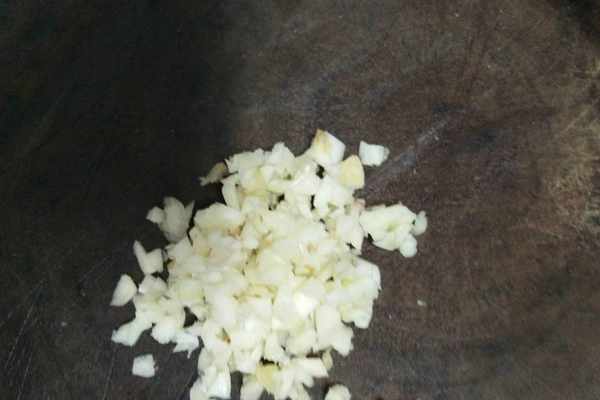 3、把大蒜切碎粒,辣椒剪成絲放在一邊備用。