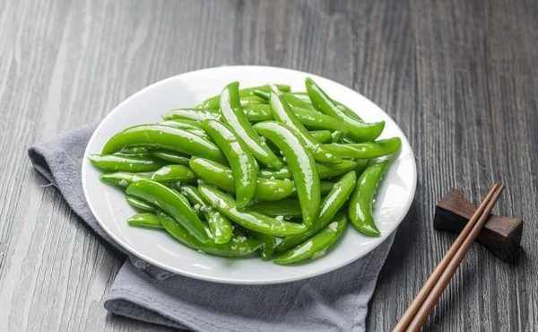 ②、起鍋倒入食用油,油熱下入蒜末炒香,下入甜豆翻炒至斷生,加入食鹽,加入食鹽翻炒入味裝盤即可。