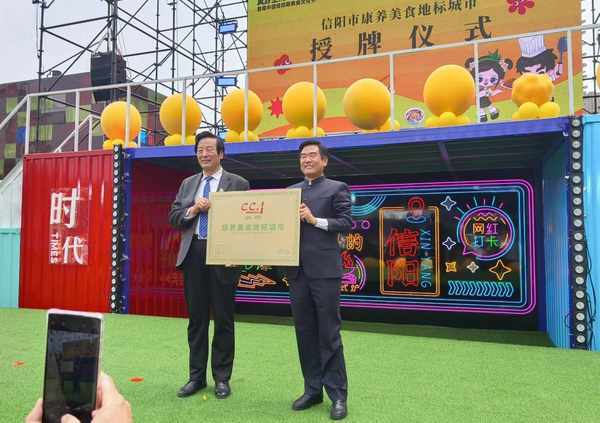 中國烹飪協會副會長孫曉春,為信陽市“康養美食地標城市”授牌,信陽市人民政府副市長呂旅代表信陽市接牌。