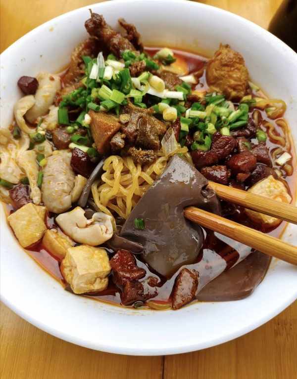 腸旺面是貴州地區的傳統美食之一,以其獨特的味道和口感而聞名。它是由豬腸、豬血、脆哨等多種食材制成的面條,以及各種香料和調味料制成的濃鬱湯汁。腸旺是常旺的諧音,寓意吉祥。腸旺面的面條是手工雞蛋面條,所以口感非常Q彈。