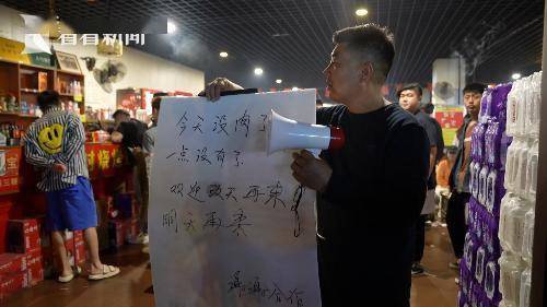 燒烤店老板楊本新,無奈開始“攆客”。店裡店外,人聲鼎沸,楊老板“勸退”的聲音被淹沒在嘈雜聲之中。他隻好拿著擴音喇叭,一遍遍地喊:“沒有肉瞭,不要排隊瞭。”