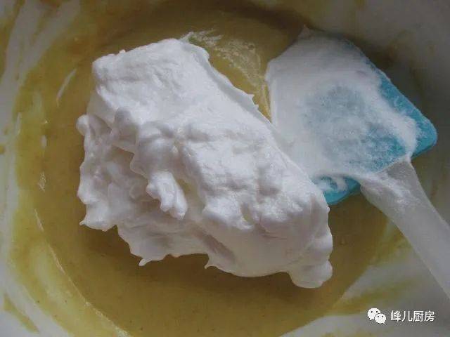 6、把蛋白霜分三次,加入到蛋黃糊中,翻拌均勻。