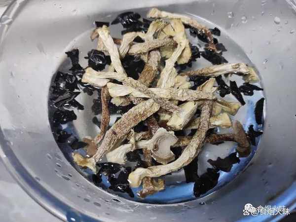 2.木耳還有鹿茸菇放在盆裡面,加入少量的溫水,水要沒過食材,放著浸泡20分鐘。木耳跟鹿茸菇浸泡用溫水浸泡,可以快速將它泡發;泡發後的食材再用清水洗2-3遍,洗凈後撈出;