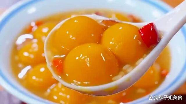 2、水開後放入丸子,再加上一勺紅糖,煮到丸子全部飄起來,加上一勺酒糟,紅棗,枸杞子,然後再煮上兩分鐘,南瓜丸子就完成瞭。