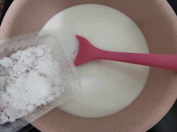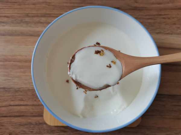 5、接著我們不要去動,等待十分鐘左右,如果成功的話,牛奶形成膏狀,勺子放到其中不會落下。那麼我們可以繼續冷卻之後,撒上桂花,或是紅豆等來增香,這樣一份夏日薑汁甜品,對於我們的身體來說真的是好處多多。