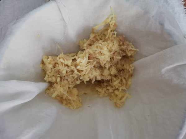 1、薑撞奶可以作為夏日的小甜品,也是不錯的吃薑方法。準備一塊生薑洗凈之後,在擦絲器上擦成最細的絲,接著放到紗佈中,把薑汁擠出。