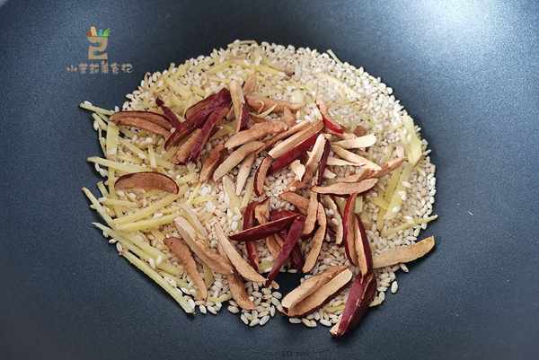 4、待生薑炒至幹癟的狀態,就可以放紅棗瞭,接著繼續快速炒,讓鍋內的三樣食材受熱均勻,彼此的香味也互相滲透。一直炒到大米色澤焦黃,紅棗和薑絲中的大部分水分都炒出去,這樣才利於保存。