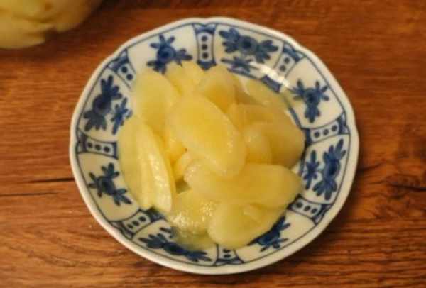 5、把薑片析出的水分擠掉,淋入醋汁進去,要多一些,確保薑片浸沒其中。接著密封之後,放到冰箱冷藏,兩三天之後就可以開始吃瞭。