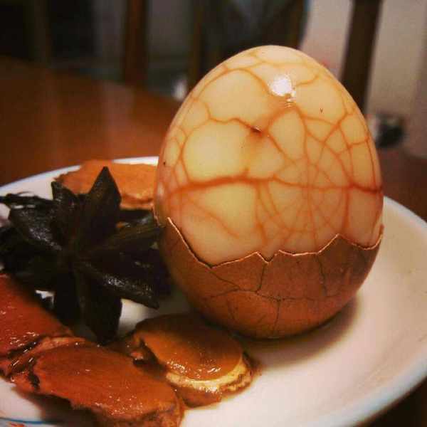 做五香茶葉蛋,五香缺一不可,不然茶葉蛋香味 不濃鬱也不入味。雞蛋煮的時候要用小火煮制,不然容易爆 裂。沒有吃完的茶葉蛋可以放在鹵水中保存,弟二天更加有味。泡制好的五香鹵雞蛋是大理石花紋。