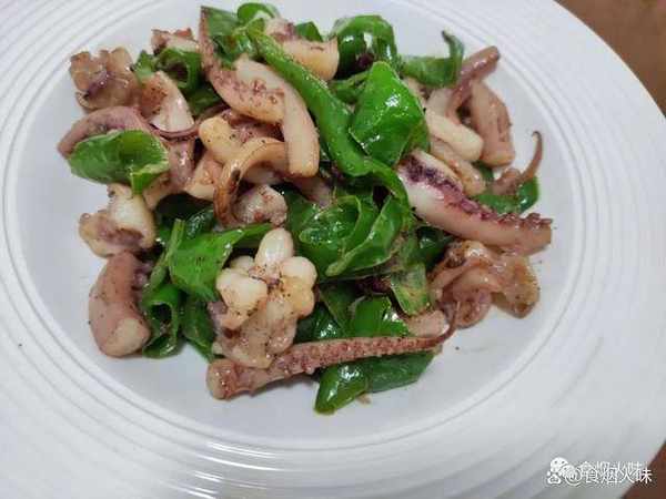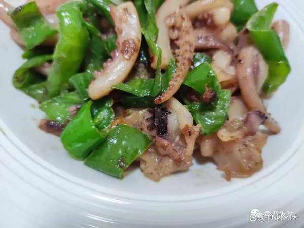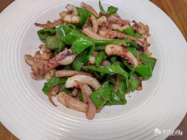 6.調味品下鍋後用鏟子將所有的食材炒均勻,我們就可以關火出鍋瞭。很快這樣子一份美味而鮮爽的魷魚頭炒螺絲椒就完成。這樣做出來的魷魚頭口感厚實而且有嚼勁,而青椒鮮甜,略帶有一點辣特別的開胃下飯,很好吃。