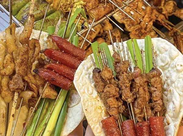 每一個燒烤桌上都有一個小烤爐,服務員會把烤得七八分熟的肉串端過來,然後客人自己想吃什麼就烤什麼,這就讓客人有瞭參與感。等肉串烤好後就用小餅一包,然後加入小蔥,再加入自己調配的調料,制作屬於自己獨特的味道。
