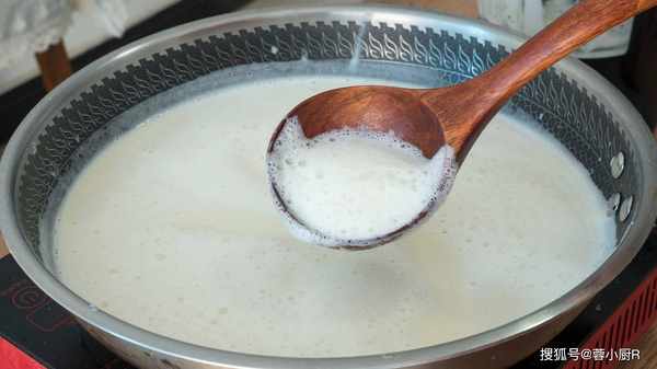 4、接著開火煮豆漿,煮的時候把豆漿表面的浮沫用勺子舀出來,豆漿煮開後轉小火繼續煮,6分鐘左右後豆漿表面會出現一層膜,這個就是腐皮瞭;
