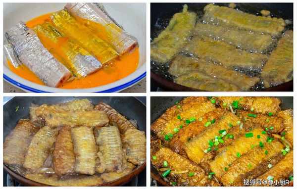 4、現在來煎帶魚,油燒熱後就轉中火,下帶魚,煎至一面金黃翻煎另一面,煎至兩面金黃就可以先出鍋瞭,差不多4分鐘的樣子就夠瞭,帶魚就全部煎好瞭。