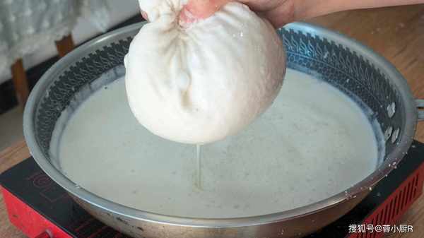 3、打好後鍋中放一塊兒紗佈過濾,把豆漿倒進來後濾出豆渣;