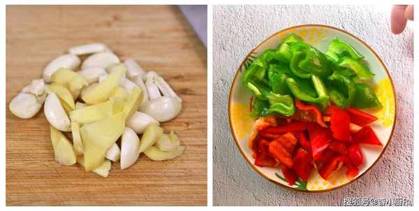1、大蒜剝成小瓣、生薑切片、青紅椒切滾刀狀;