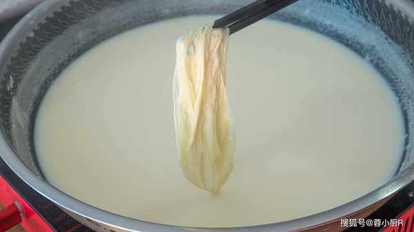5、關火後用筷子挑起來就可以瞭,接著重新開小火煮,煮至小沸騰的狀態後關火,然後等待表面出現另一張可以被挑起的腐皮;