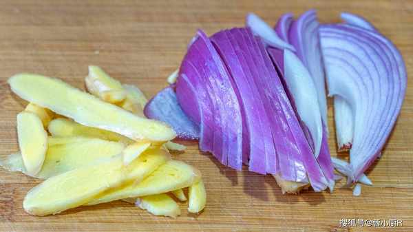 2、接著我們切半個洋蔥,切成絲備用,再來切一塊兒生薑。