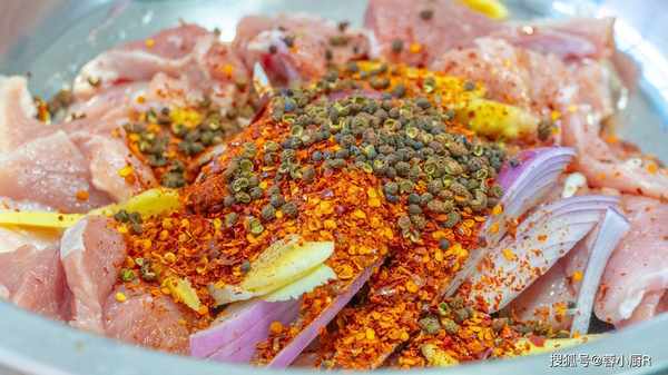 3、切片後和洋蔥一起丟進肉裡面,用來去腥增香,接著來調味兒。生抽、料酒、蠔油、鹽、糖、五香粉、辣椒粉、花椒 。