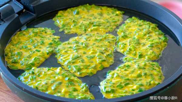 5、烙到一面定型後再翻另一面,這個韭菜餅是特別容易熟的,剛開始是定型,然後一分鐘左右,表面的雞蛋就會開始上色。