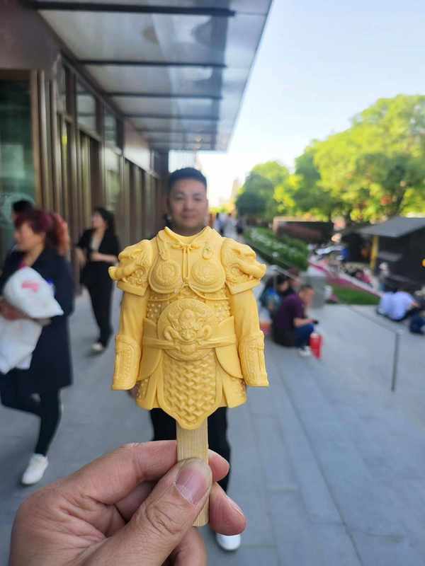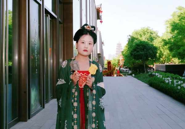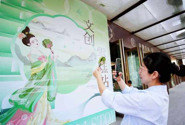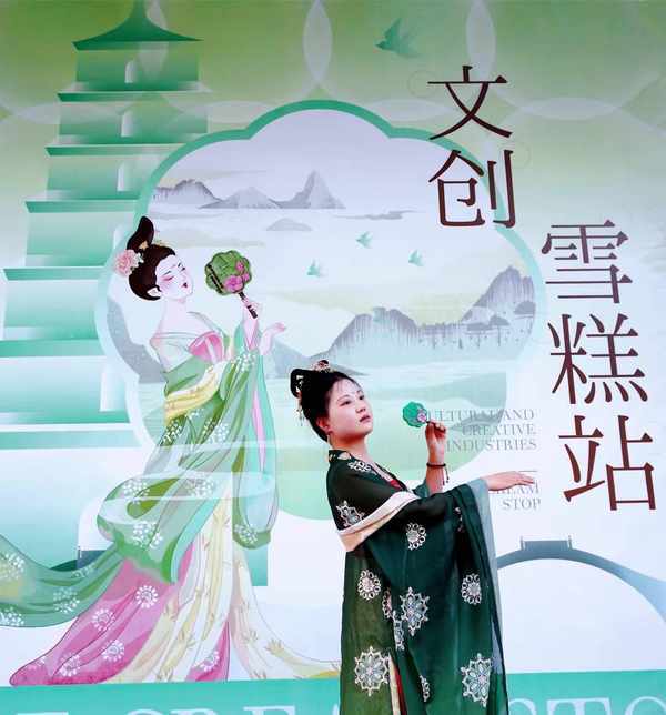 團扇多色冰淇淋,外形以唐代團扇為原型,上繪圖案展現的遠景是西安歷史文化地標大雁塔,近景石榴花是出自西安大唐銅鏡博物館館藏文物的背部紋飾,並配有兩句詩文,盡顯長安繁華。大唐明光鎧冰淇淋,則是以唐代甲胄為原型,護腰和護肩都是虎頭形狀,每一片鱗甲都精細呈現,還推出巧克力、芒果兩種口味供遊客選擇。雪糕互動解鎖打卡新方式在任何一個城市,穿著唐裝、漢服走在大街上都有些格格不入,除瞭西安。