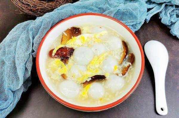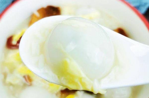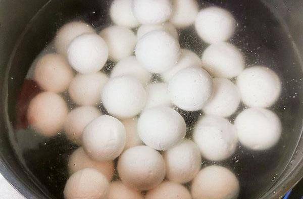 7. 小湯圓飄起後倒入打散的雞蛋液,攪勻。