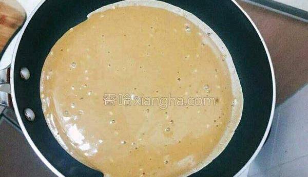6.用不粘鍋,不要刷油,刷瞭油會很油膩,把面粉糊倒進去搖均勻,開小火煎