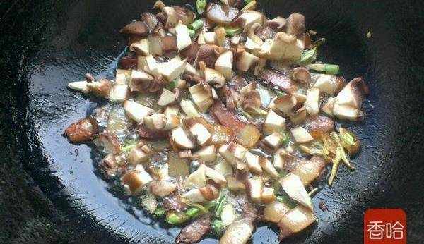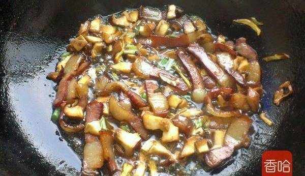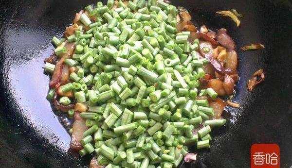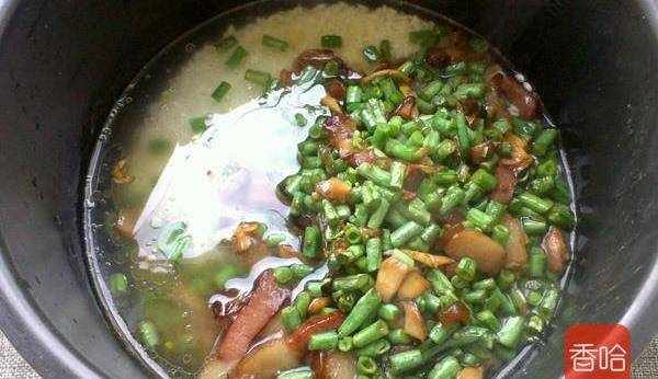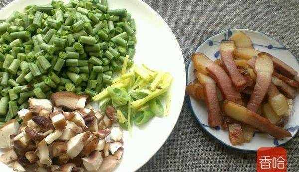 3.豆角香菇切丁,蔥薑切絲,臘肉切薄片