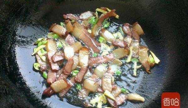 4.炒鍋熱油,放蔥薑爆香,下入臘肉編炒
