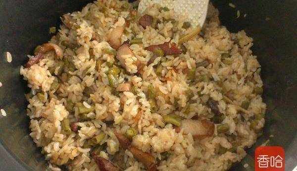 10.把炒好的臘肉豆角倒進電飯煲裡拌勻