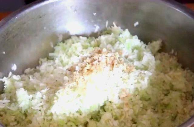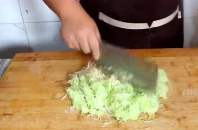 這時土豆也給它削皮擦成絲(放入土豆可以使丸子口感比較酥脆)。將過涼水的蘿卜絲給它擠幹水分,然後和土豆放在一起剁碎,剁得也不用特別的碎,剁好以後放入盆中。